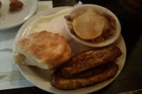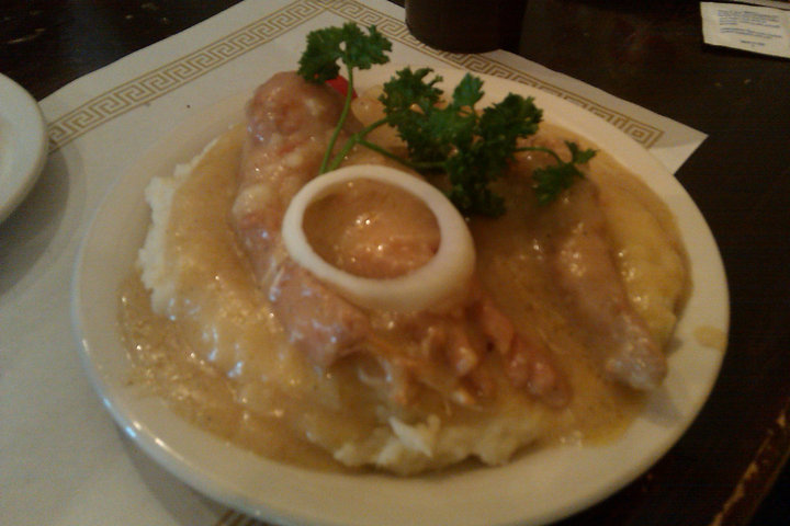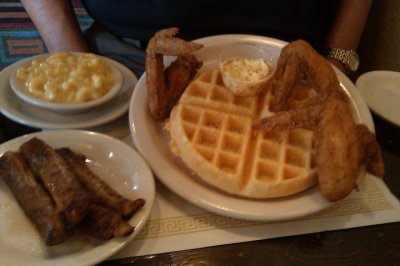 Sadly, the couple that first introduced me to Maxine’s Chicken and Waffles could not make it to dinner to share in the smorsgasbord of food.  So instead, I contacted Kenny and Jen, another Indianapolis couple I know to join me.  🙂  Jen went for the Smothered Chicken, which is a boneless fried chicken breast smothered in gravy, served on top of mashed potatoes.  And Kenny opted for the Two Eggs Your Way that comes with smoked sausage, toast and house potatoes.   Needless to say, there was enough food for a small platoon!  Perhaps I’ll have a couple of guest bloggers come in and write about their experiences at Maxine’s.  But I can tell you one thing, you can never go wrong when you smother fried food with southern style gravy!   🙂   As for the smoked sausage and breakfast option.   The sausage is peppery.  The smoke is light, so it’s not like a strong smoked flavoured dinner sausage.  But it’s a nice balance to go with a lighter breakfast course.