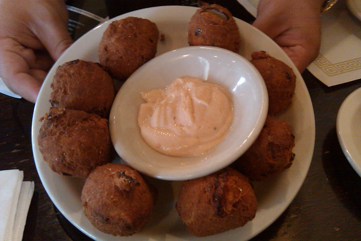 Now, as anyone that has spent any time with me over the dinner table knows, I am not the type of person to only order one dish, if I am visiting a hole-in-the-wall or great Mom-and-Pop place.    So I went all out.  I was told that the Fried Green Tomatoes are a must to order for appetizers, but unfortunately, they were all out of green tomatoes.  The server also highly recommended the grilled chicken wings with a sweet glaze sauce, but since I knew I was going for the Chicken and Waffles, I decided against it.  Instead, I started with Salmon Bites.  They are breaded salmon and bread crumbs that have been seasoned and deep fried, served with a spicy aioli sauce.  It was decent, but I usually enjoy my salmon smoked or raw.  But the fishy taste of fully cooked salmon was cut back with the spicy aioli sauce.